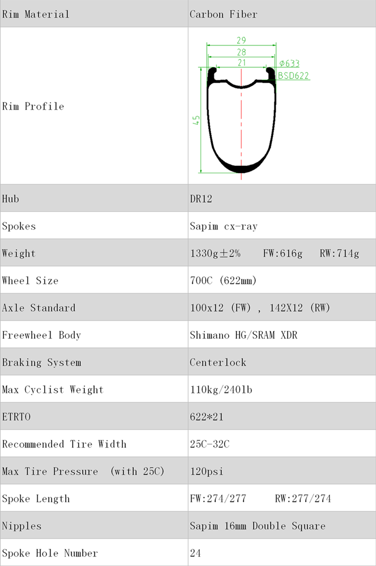 我们的轮组在中国手工组装和调整,并保证最高质量标准!花鼓采用航空级铝合金CNC加工,抗疲劳强度高,重量轻。即使在最恶劣的环境中,阳极氧化也可以确保美观并防止腐蚀。碳纤维轮圈由在我们轮圈工厂拥有多年工作经验的工人手工制作。通过特殊的排叠碳纤维预浸料提高了轮圈的强度和抗疲劳性。CRW Works轮圈不需要打磨喷漆,可以保持更好的强度,提供额外的可靠性和强大的抗冲击性以及足够轻的重量。轮圈内宽21mm,外宽28mm。它具有相当大的侧向刚性和出色的空气动力学性能。适用于综合路况,在艰难的爬山路上,这款45毫米高轮组也能够胜任,并且具有空气动力学轮廓和破风Sapim CX-Ray 辐条的轮组将为您提供帮助。