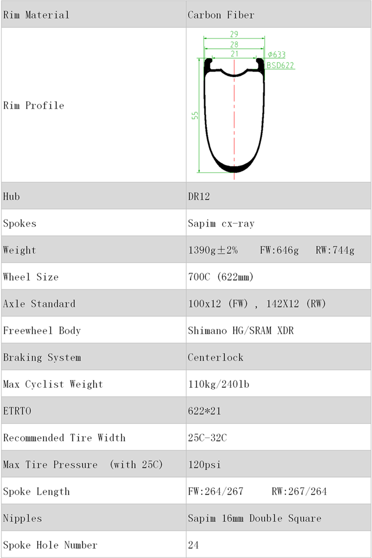 我们的轮组在中国手工组装和调整,并保证最高质量标准!花鼓采用航空级铝合金CNC加工,抗疲劳强度高,重量轻。即使在最恶劣的环境中,阳极氧化也可以确保美观并防止腐蚀。碳纤维轮圈由在我们轮圈工厂拥有多年工作经验的工人手工制作。通过特殊的排叠碳纤维预浸料提高了轮圈的强度和抗疲劳性。CRW Works轮圈不需要打磨喷漆,可以保持更好的强度,提供额外的可靠性和强大的抗冲击性以及足够轻的重量。轮圈内宽21mm,外宽28mm。它具有相当大的侧向刚性和出色的空气动力学性能。在平坦的路面这款轮组是你最好的选择,并且具有空气动力学轮廓和破风Sapim CX-Ray 辐条的轮组将为您提供帮助。